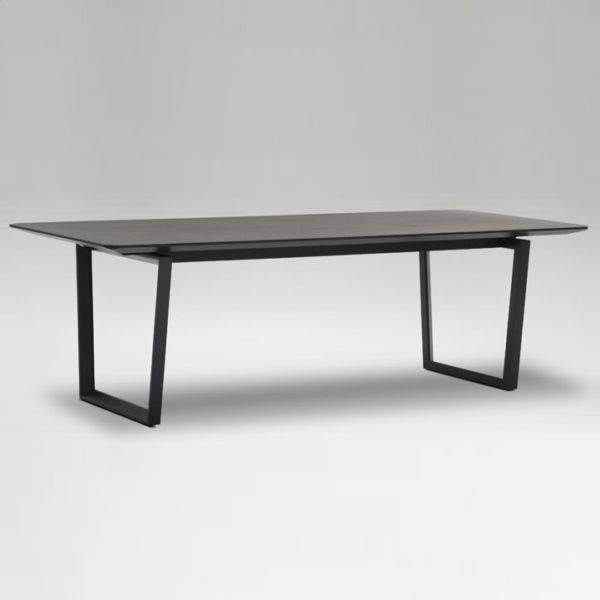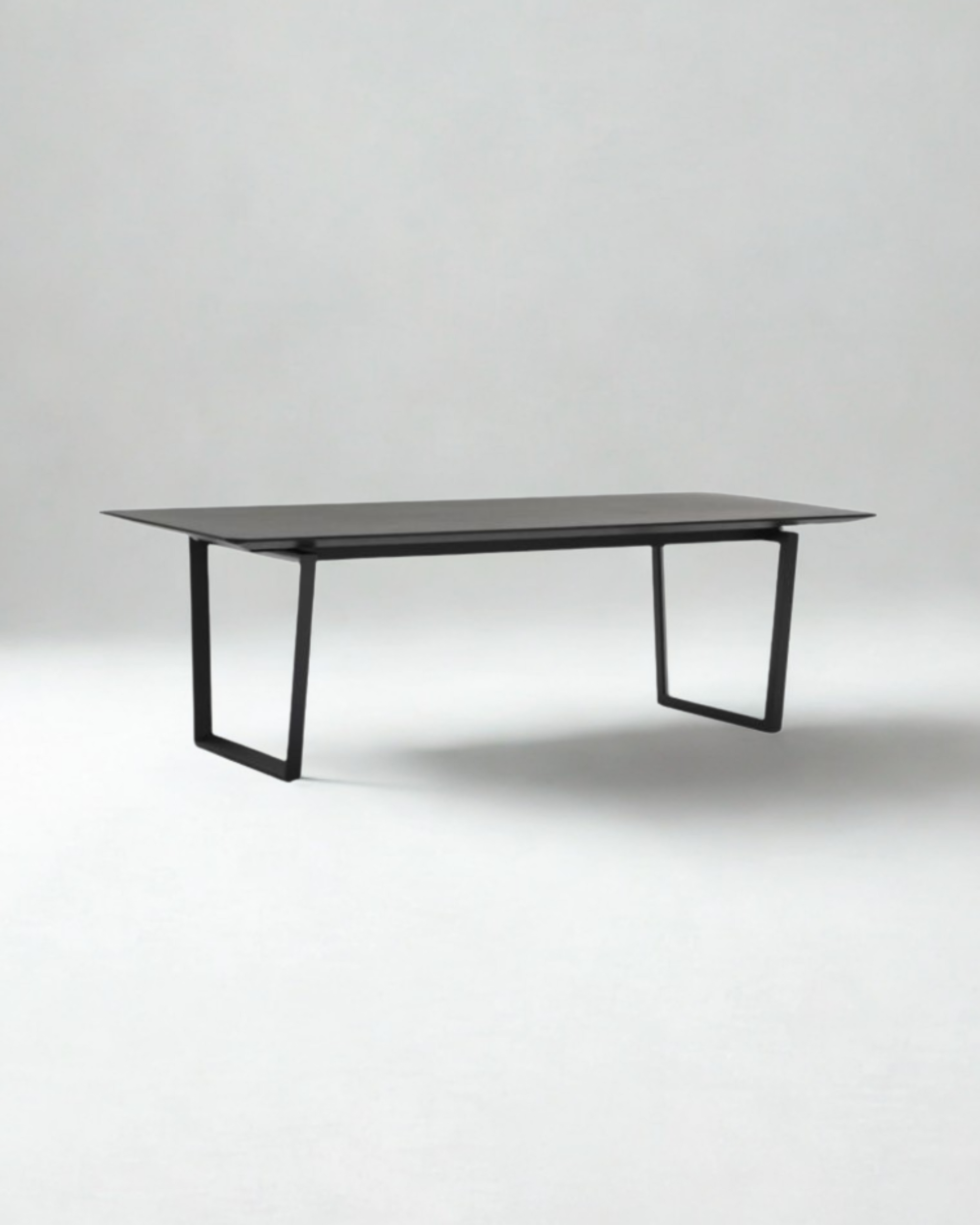 The "Basalt" Dining Table from Metallures is a celebration of clean lines and powerful form. Its name, inspired by dark volcanic rock, reflects the table's solid, enduring presence. The sleek, matte black surface and U-shaped powder-coated metal legs make this table a striking centerpiece for any modern dining or conference space.