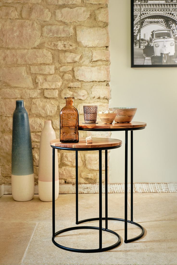 - 1 x Small Duo Circle Nesting Table (pure wood top, matte black powder-coated metal frame)