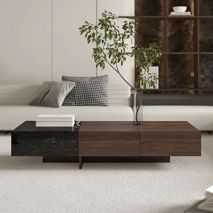 - Striking Mixed-Material Design: A captivating blend of natural walnut wood and elegant polished black marble tabletops.